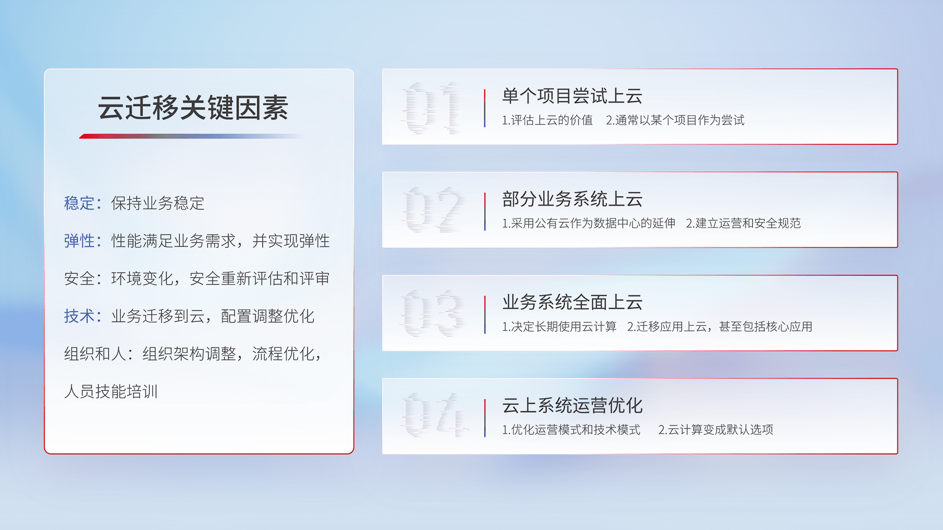 结合实际业务,,,,从规划设计、、、、云平台选型、、、云原生改造、、、数据迁移、、、集成交付,,,,迁移全过程为客户识别最佳上云路径,,,,做好风险识别管理,,设计网络架构、、、身份权限、、、、安全审计合规、、、、操作审计、、、日志审计、、、、监控告警策略、、多站点容灾设计等,,,对云上基础设施进行整体规划,,提升IT治理水平,,,以满足弹性、、高可用、、高性能的需求。。