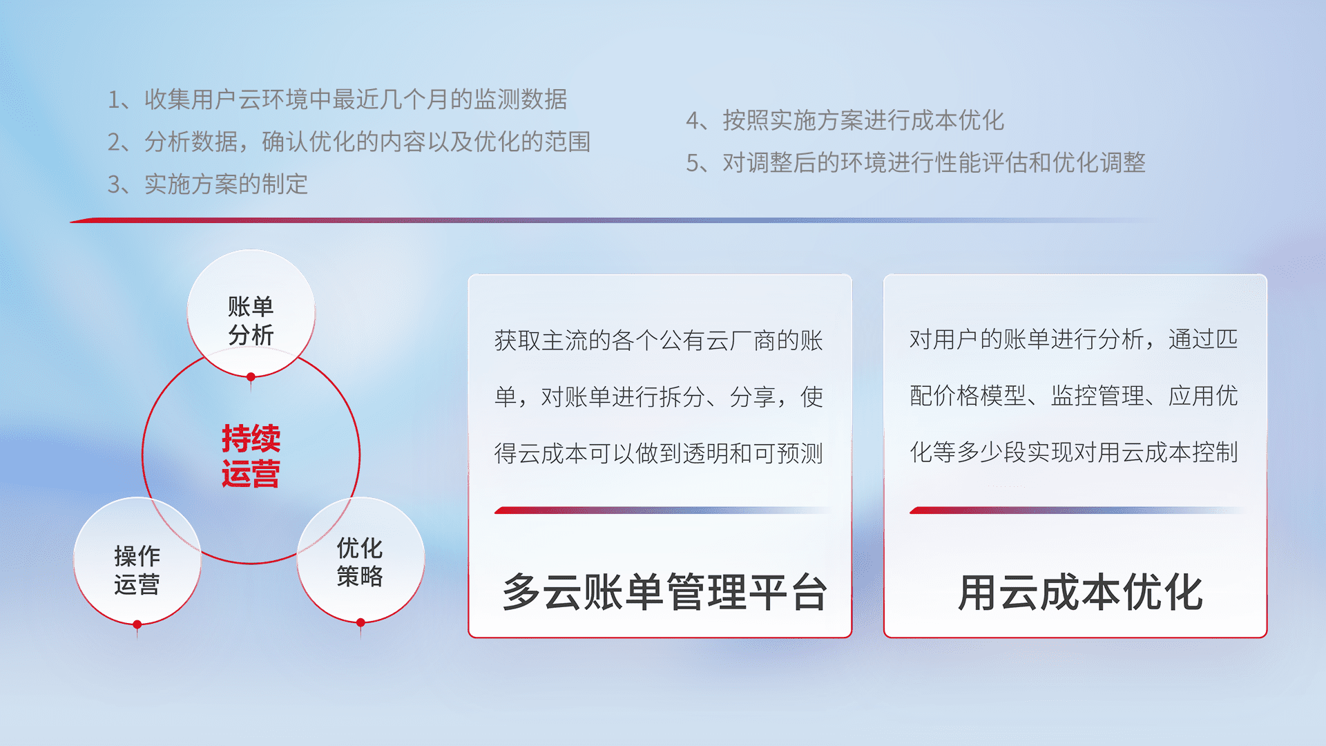 通过多云纳管,,,以统一的资源数据模型把客户的云资源进行抽象和封装,,进而实现对多云资源的统一操作,,保障云资源管理的可靠性、、、、稳定性与可用性。。量身定制化运维内容,,,,配置、、、开发运维、、、补丁管理、、备份、、监控、、认证和访问管理、、审计和日常巡检等,,保障在用云过程中的可靠度,,,稳定度以及高可用率。。。