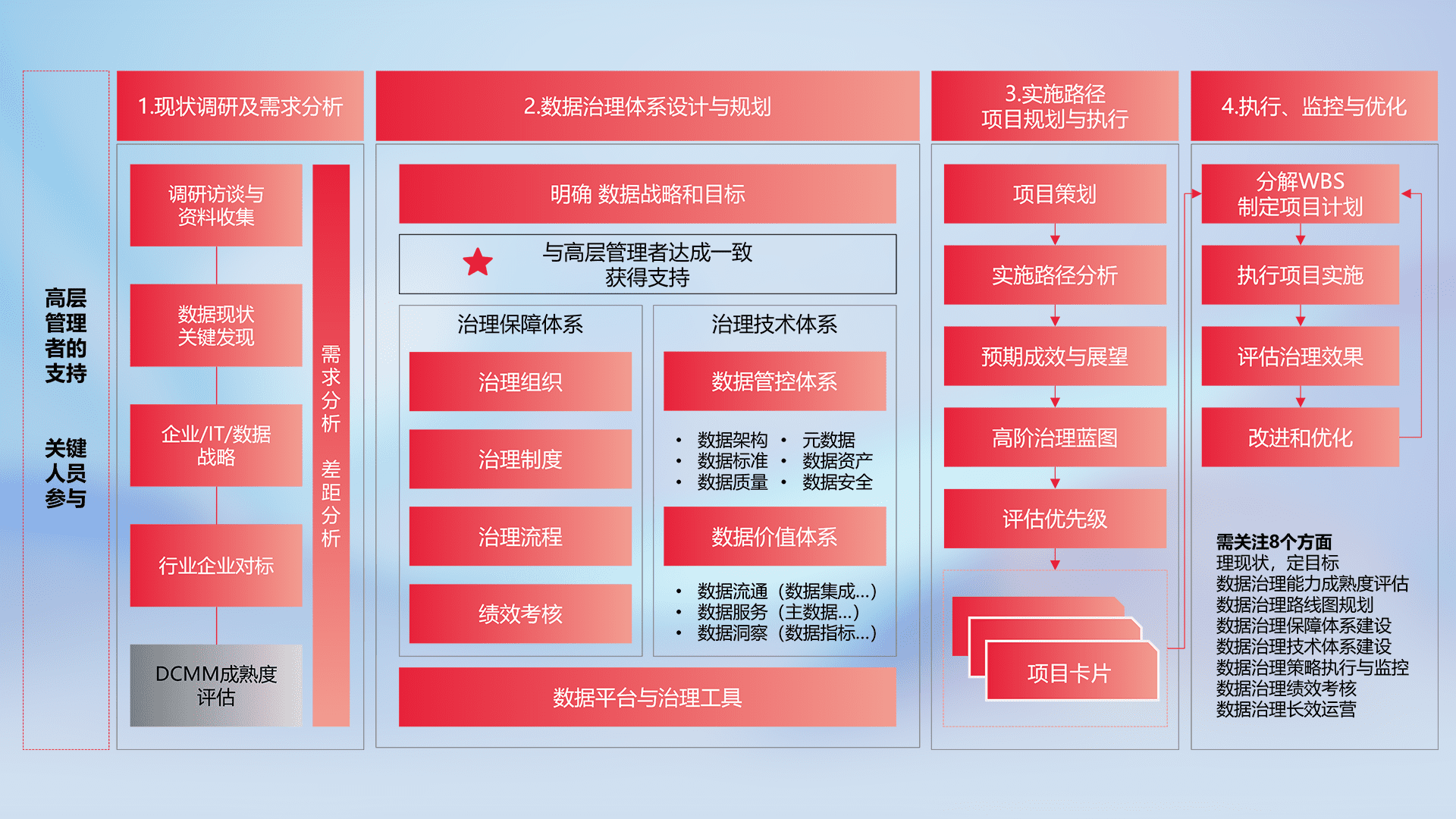 制定并执行统一的数据标准,,,规范数据定义和格式,,,,消除冗余和不一致性,,,实现跨部门和跨系统的数据一致性,,,为企业提供标准化的数据基础。。